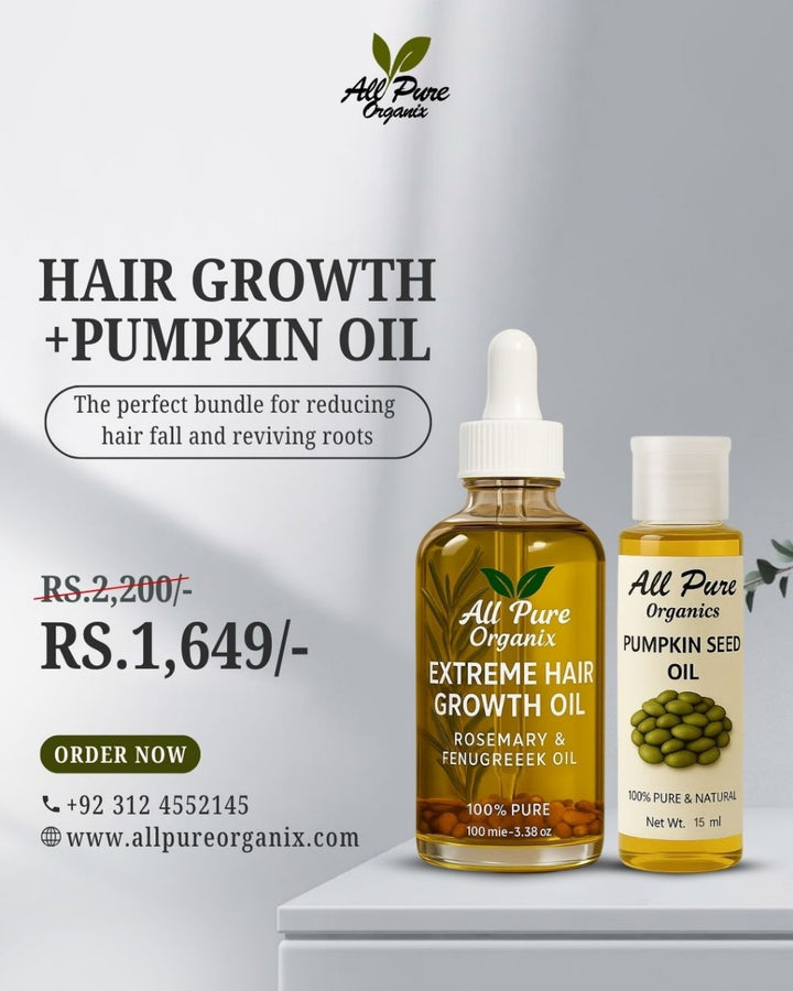 Carefully crafted with a nourishing blend of natural oils, this bundle combines the power of Hair Growth Oil with a 15 ml bottle of Pumpkin Seed Oil to deliver complete care for your hair and scalp. Rich in essential fatty acids, antioxidants, and vitamins, this duo works in harmony to strengthen roots, boost growth, and restore shine.